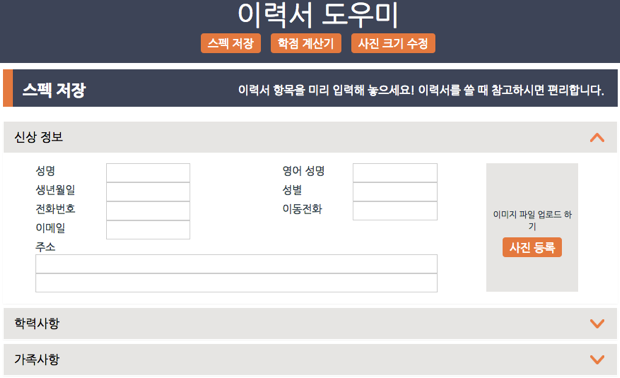 - 이력서 항목 미리 저장 (신상, 학력, 가족, 병역, 자격/면허증, 경력, 외국어 시험, 수상경력, 해외연수)