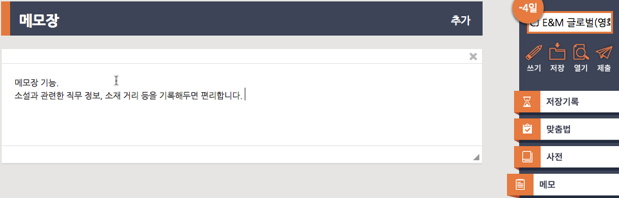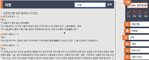소설 집필 중 모르는 단어가 있으면 우측 사전 메뉴를 클릭하여 바로 검색 가능합니다. 소설 집필이 대부분 한글로 작성되기 때문에 국어사전만 검색할 수 있네요.