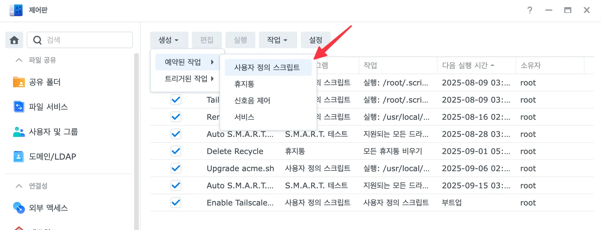② DSM 제어판 > 작업 스케줄러 > 트리거 된 작업 > [사용자 정의 스크립트] 클릭