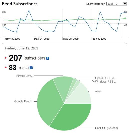 피드버너를 보니 현재 207명이 제 블로그를 구독하고 있고, 그중 HanRSS로 구독하는 분이 제일 많았습니다..71명으로 집계 되었는데, HanRSS로 들어가 구독자수를 확인해보니 정확히 일치했습니다. 피드버너 분석기능은 상당히 뛰어난 것 같네요.. 다음으로 구글리더, 파이어폭스 라이브북마크 순으로 많았습니다. 역시 구독자 분 대부분이 한국분이다보니 HanRSS 이용자분들이 월등히 많습니다.